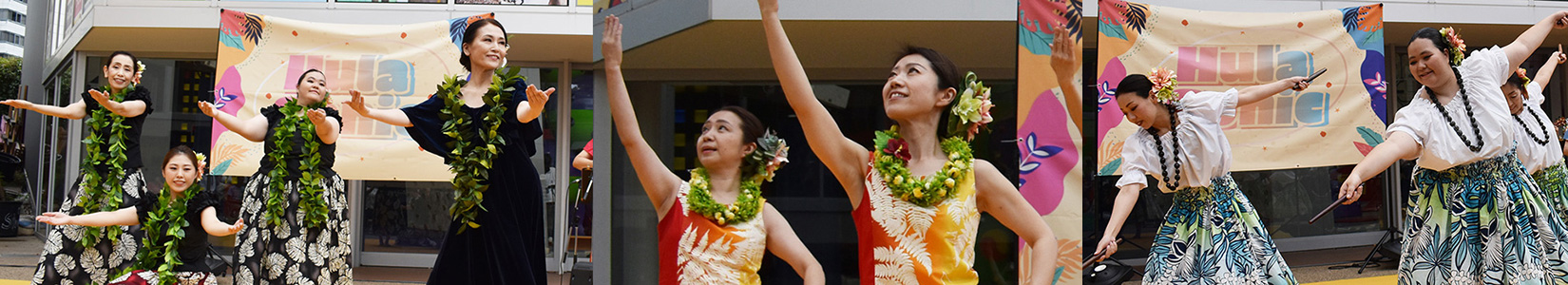 生徒の中でウクレレを弾く皆さんで結成したホオヘノオプウヴァイ ポーアルアの皆さんによるウクレレと歌で4曲、CDで4曲を踊りました。