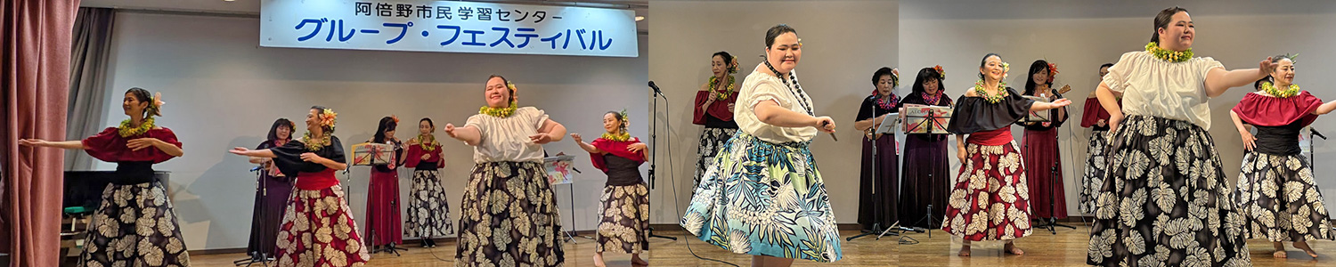 こんにちは!恒例の阿倍野市民学習センターフェスティバルに今年も参加しました。ホオヘノオプウヴァイはウクレレ隊によるウクレレと歌で、3曲を踊りました。昨年フラを始めた仲間が頑張って初めてのステージに。温かい拍手をいただきました。